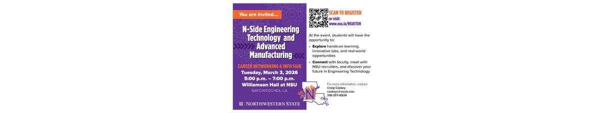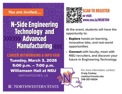 Northwestern State University's Department of Education Technology will host N-Side Engineering Technology and Advanced Manufacturing where prospective high school students can learn about careers and scholarship opportunities, connect with faculty and network with industry professionals in the region.