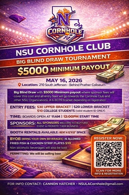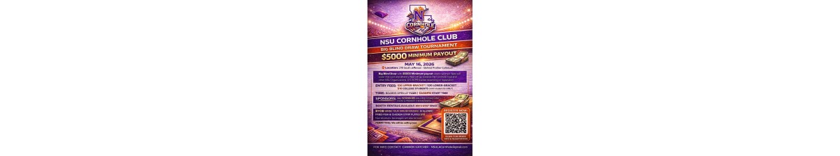 Big Blind Draw with $5000 minimum payout where all sponsor fees will cover this cost and all entry fees will go towards the Cornhole Club and other NSU organizations.