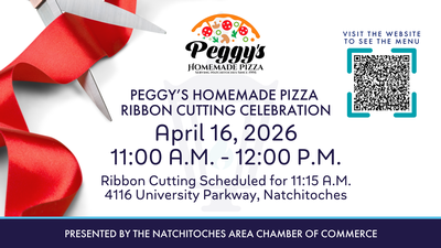 The Natchitoches Area Chamber of Commerce invites you to celebrate over 30 years of service with Peggy's Homemade Pizza on Thursday, April 16th from 11:00 a.m. to 12:00 p.m. at 4116 University Parkway, Natchitoches, LA.