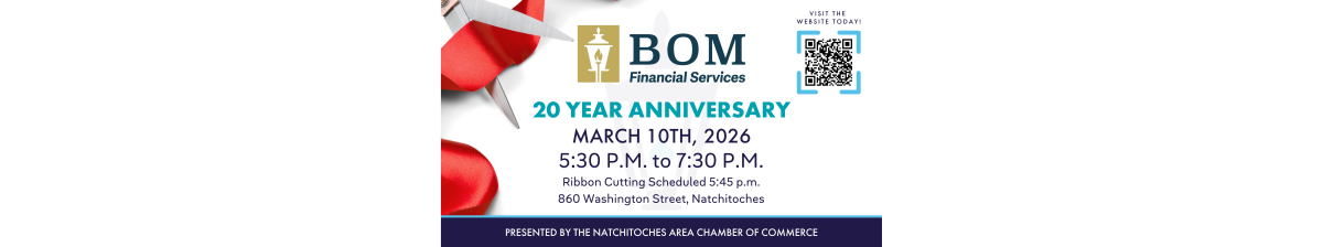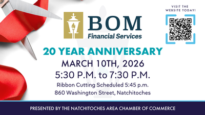 The Natchitoches Chamber of Commerce is thrilled to present the official 20 year anniversary ribbon cutting ceremony for BOM Financial Services! You're invited to join us on Tuesday, March 10th from 5:30 p.m. to 7:30 p.m. at 860 Washington Street, Natchitoches, LA.