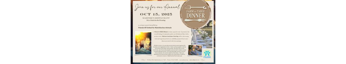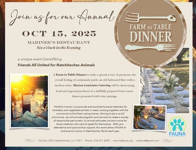 Don't miss this opportunity to savor food and wine pairings and amazing scenery... all while supporting the animals and mission of Friends All United for Natchitoches Animals. Reserve your spot at the table or sponsor today! To download and print the flyer, please click the following link: https://www.npfauna.org/event/farm-to-table/