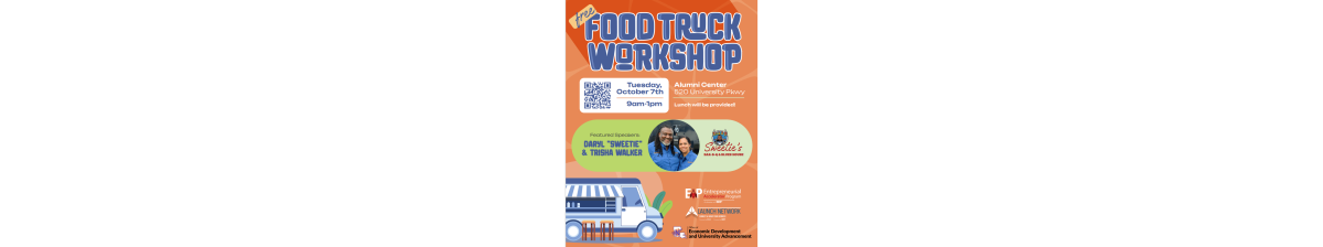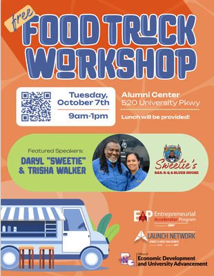 Interested in launching a food truck business? Or perhaps you need help getting off the ground? Join us for a Food Truck Workshop on October 7th from 9 a.m. - 1 p.m. at the Office of Alumni & Development. This workshop will provide comprehensive guidance on starting and running a successful food truck, from concept to launch. Hear directly from local experts Daryl "Sweetie" Walker and Trisha Walker of Sweetie's Bar-B-Q & Blues House, and gain valuable insights into planning, licensing, marketing, and day-to-day operations.