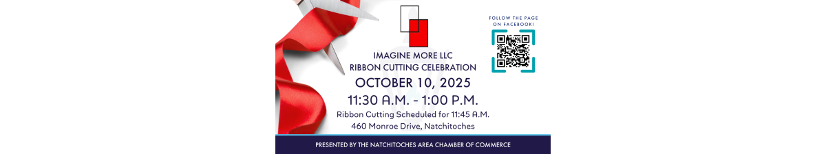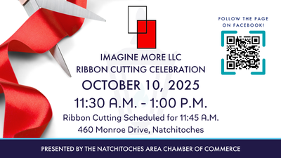 The Natchitoches Chamber of Commerce is thrilled to invite you to the ribbon cutting ceremony for Imagine More LLC, a unique wellness space offering heart-centered yoga, art, and healing services right here in Natchitoches. Join us on Friday, October 10th as we celebrate this inspiring addition to our local wellness and arts community.