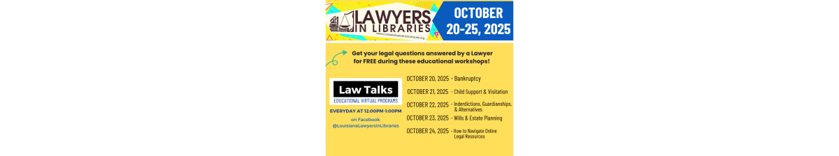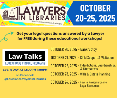 This year's program will take place October 20-24, featuring both in-person consultations and virtual educational sessions on timely legal topics. The online sessions will be livestreamed daily from 12-1 pm on the LSBA Louisiana Lawyers in Libraries Facebook page.