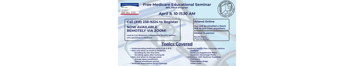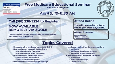 The Natchitoches Parish Library (NPL) is expanding access to its established Medicare Educational Seminar by offering the program via Zoom for the first time, giving community members the flexibility to participate from home or wherever is the most convenient. The free seminar, led by Independent Benefits Advisor Cori Richardson, will take place Thursday, April 9, from 10 to 11:30 a.m. In-person attendance remains available at the NPL's Main Branch, located at 450 Second Street in Natchitoches.