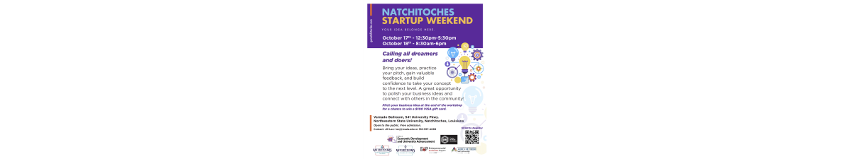 This event is sponsored by the Office of Economic Development and University Advancement in partnership with the Center on Rural Innovation (CORI), Natchitoches Area Chamber of Commerce, Natchitoches Economic Development Alliance (NEDA), and the Entrepreneurial Accelerator Program (EAP). For more information, please contact Jill Leo at leoj@nsula.edu.