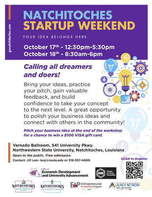Have a business idea - or just thinking about one? Join us for the Natchitoches Startup Weekend on October 17-18. This hands-on event is a great opportunity to bring your ideas, practice your pitch, gain valuable feedback, and build confidence to take your concept to the next level. It's the perfect chance to polish your business ideas and connect with others in the community. Pitch your ideas at the end of the workshop for a chance to win a $100 VISA gift card.