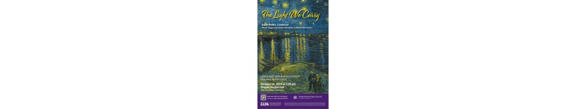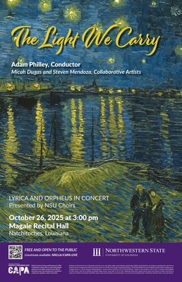 Northwestern Lyrica and Orpheus will present a concert "The Light We Carry" on Sunday, Oct. 26 at 3 pm in Magale Recital Hall. Adam Philley, associate director of Choral Activities, will conduct this fall choral performance, and Micah Dugas and Steven Mendoza will serve as collaborative artists.