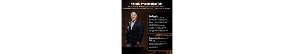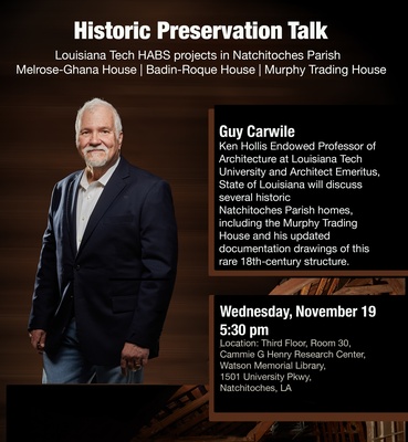 The historic preservation talk will be at 5:30 p.m. Wednesday, Nov. 19 in the Cammie G. Henry Research Center located on the third floor of Watson Memorial Library, 1501 University Parkway, Natchitoches.