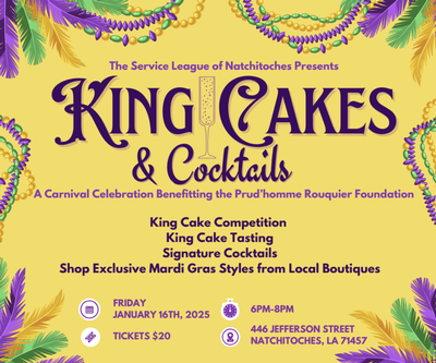 Celebrate the Mardi Gras season in style with an evening of festive fun at King Cakes & Cocktails! Join us on Friday, January 16th, from 6-8 PM at the historic Prud'homme-Rouquier House as we bring the spirit of carnival to life with: