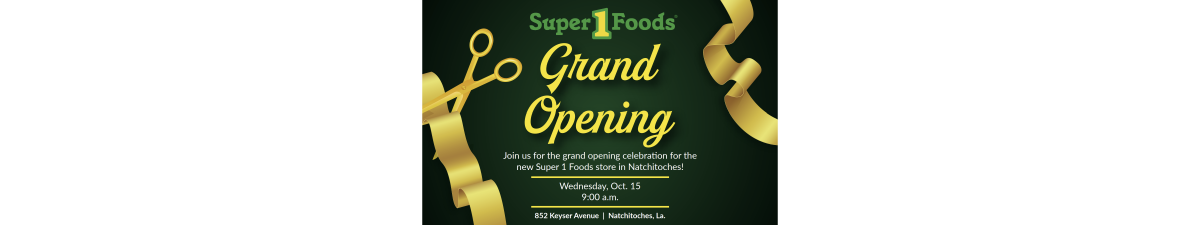 Super 1 is proud to announce the grand opening of the new Super 1 Foods in Natchitoches! The ceremony is scheduled for Wednesday, October 15 at 9 am and they would love you to join the celebration.